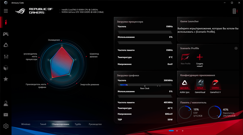 Приложения | Armoury Crate GameFirst V Sonic Studio GameVisual Aura Creator | |