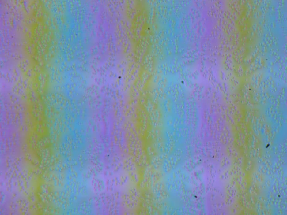 Зерно этих дефектов в несколько раз меньше размеров субпикселей (масштаб этих двух фотографий примерно одинаковый), поэтому фокусировка на микродефектах и «перескок» фокуса по субпикселям при изменении угла зрения выражены слабо, из-за этого нет и «кристаллического» эффекта.