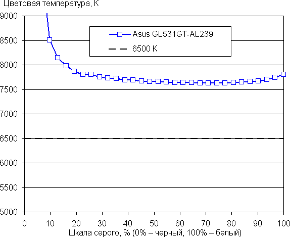 Баланс оттенков на шкале серого хороший, так как цветовая температура не сильно выше стандартных 6500 К, а отклонение от спектра абсолютно чёрного тела (ΔE) ниже 2, что для потребительского устройства считается великолепным показателем. При этом цветовая температура и ΔE мало изменяются от оттенка к оттенку — это положительно сказывается на визуальной оценке цветового баланса (самые тёмные области шкалы серого можно не учитывать, так как там баланс цветов не имеет большого значения, да и погрешность измерений цветовых характеристик на низкой яркости большая).