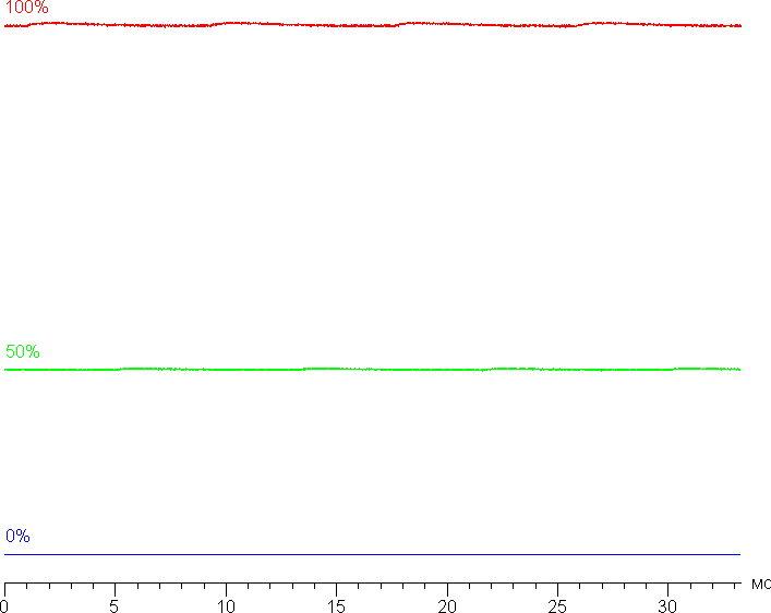 На любом уровне яркости значимая модуляция подсветки отсутствует, поэтому нет и никакого мерцания экрана. В доказательство приведём графики зависимости яркости (вертикальная ось) от времени (горизонтальная ось) при различных значениях настройки яркости: