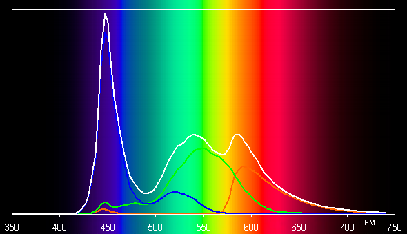 Такой спектр с относительно узким пиком синего и с широкими горбами зелёного и красного цветов характерен для экранов, в которых используется белая светодиодная подсветка с синим излучателем и жёлтым люминофором. Видно, что светофильтры матрицы существенно подмешивают компоненты друг к другу. Это сужает цветовой охват (цвета становятся бледнее), но позволяет получить большую яркость при меньших затратах энергии на подсветки.