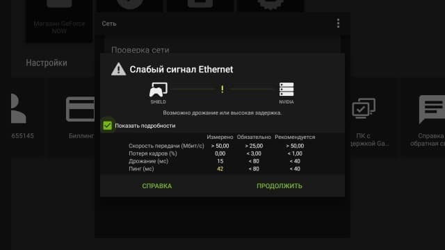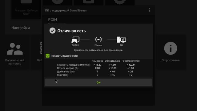 Для работы с сервисом вам, конечно, потребуется достаточно быстрый доступ к интернету. Для проверки качества связи в утилите Nvidia Games есть специальный пункт. Согласно рекомендациям, скорость получения данных должна быть более 50 Мбит/с. Кроме неё оцениваются потери и задержки. Последние могут зависеть не столько от вашего провайдера, сколько от канала до серверов компании.
