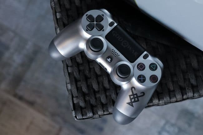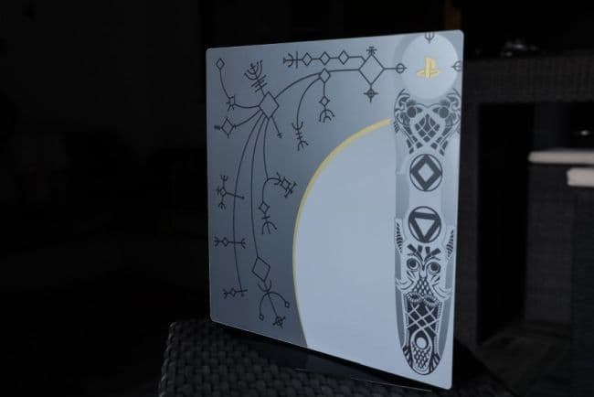 DualShock 4 также выполнен в цвете консоли. Получилась стильная комбинация тёмно-серого и серебристого. На геймпаде изображён знак братьев-хульдры, тех самых гномов, что изготовили топор Левиафан.