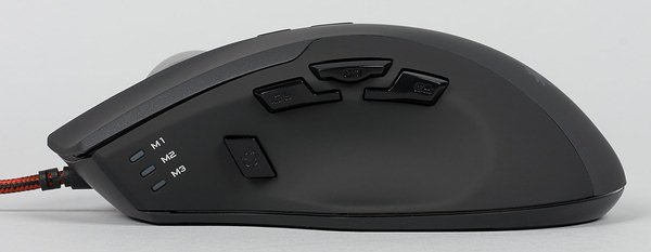 Боковые кнопки в левой части представляют собой группу из трех кнопок G6, G7 и G5 (слева направо) оригинальной формы, а также расположенной чуть ниже слева кнопки со стилизованным значком прицела. Правая часть корпуса мыши дополнительных кнопок не имеет.