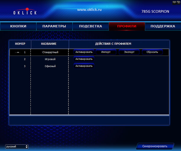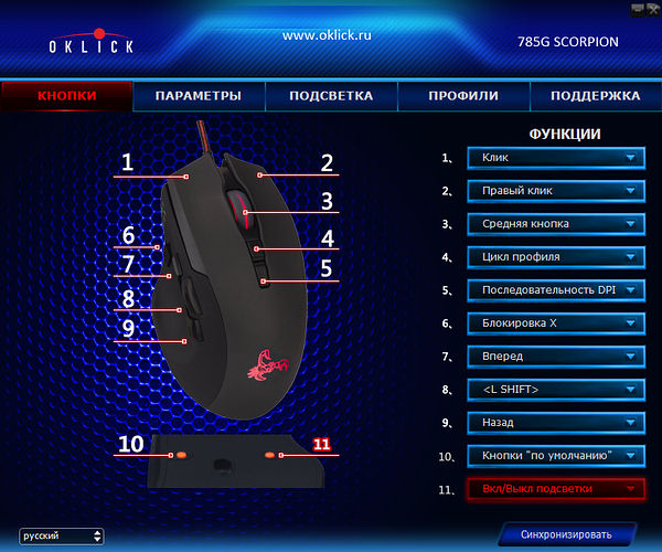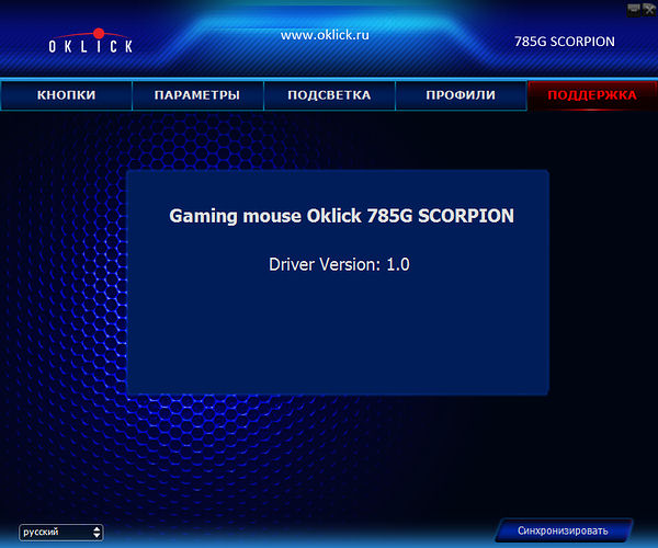 Штатное ПО (при тестировании использовалась версия 1.0) обходится системными драйверами, поэтому Oklick 785G Scorpion определяется как HID-совместимая мышь.