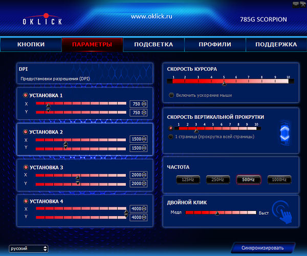 В разделе «ПАРАМЕТРЫ» можно настроить каждое из 4 поддерживаемых разрешений в диапазоне от 250 до 4000 (напомним, что максимальное физическое разрешение сенсора составляет 2000, значения выше этого числа являются результатом программной обработки) точек на дюйм (DPI) с шагом 250, системное ускорение и системную скорость указателя, скорость вертикальной прокрутки, скорость двойного нажатия и частоту опроса порта (125 Гц, 250 Гц, 500 Гц, 1000 Гц).