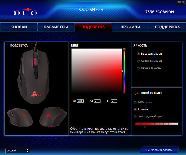 Настройки подсветки позволяют выбрать произвольный цвет или ввести значения RGB, один из 3 уровней яркости и цветовой режим — пользовательский цвет (RGB-режим), последовательный перебор 7 основных цветов или пульсирующий цвет с настройкой интенсивности.
