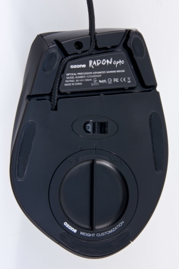 Перевернем мышь. Рядом с оптическим сенсором Avago 3090 внимание сразу привлекает система пазов, благодаря которой двухметровый кабель в текстильной оплетке можно вывести с любой стороны мыши. Полезная и нечасто встречающаяся функция. В барабане скрываются 5 грузиков по 4,5 грамма. Покоится Radon Opto на пяти тефлоновых ножках.