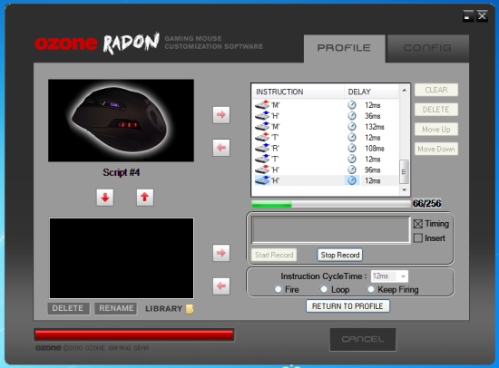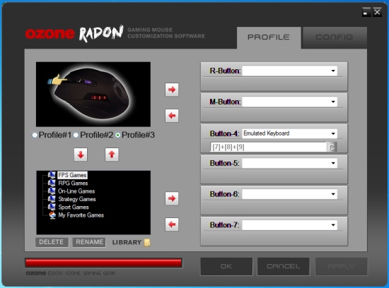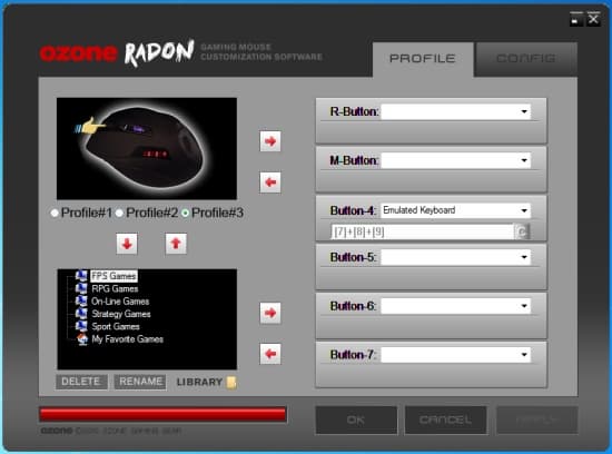 Утилита Ozone Radon устанавливается с прилагаемого диска. В первой вкладке происходит настройка профилей. Создается впечатление, что интерфейс программы был написан «на коленке». Список кнопок может произвольно заблокироваться при настройке. Сохранение и перемещение настроек реализованы при помощи малопонятных стрелок. Детали на миниатюре черной мышки неразборчивы: хорошо, что есть иконка-подсказчик.