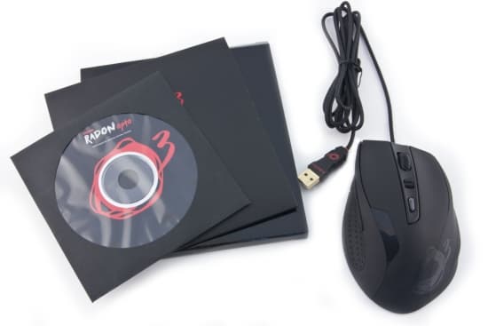 Корпус Radon Opto разнообразием не балует. 100% черного цвета, 90% покрытия софт-тач. Остальные 10% приходятся на вставку колесика, индикатор DPI, пару боковых кнопок и логотип компании.