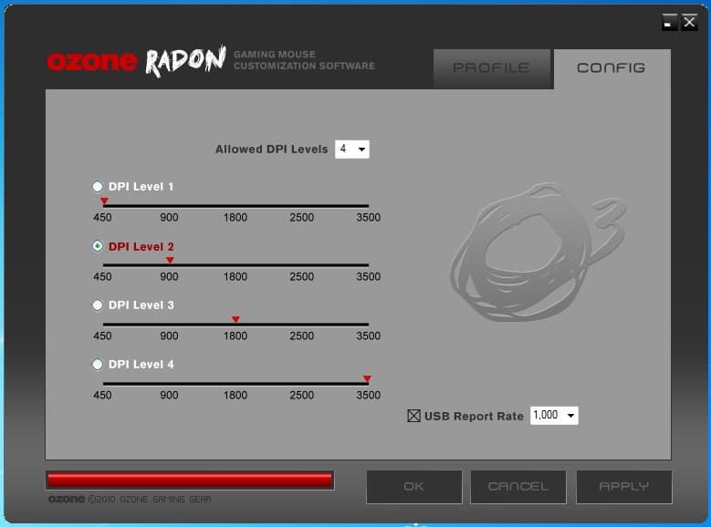 Для настройки DPI доступно всего пять уровней: 450, 900, 1800, 2500, 3500. Такие большие «шаги» сводят на нет возможность настройки хотя бы с приблизительной точностью.