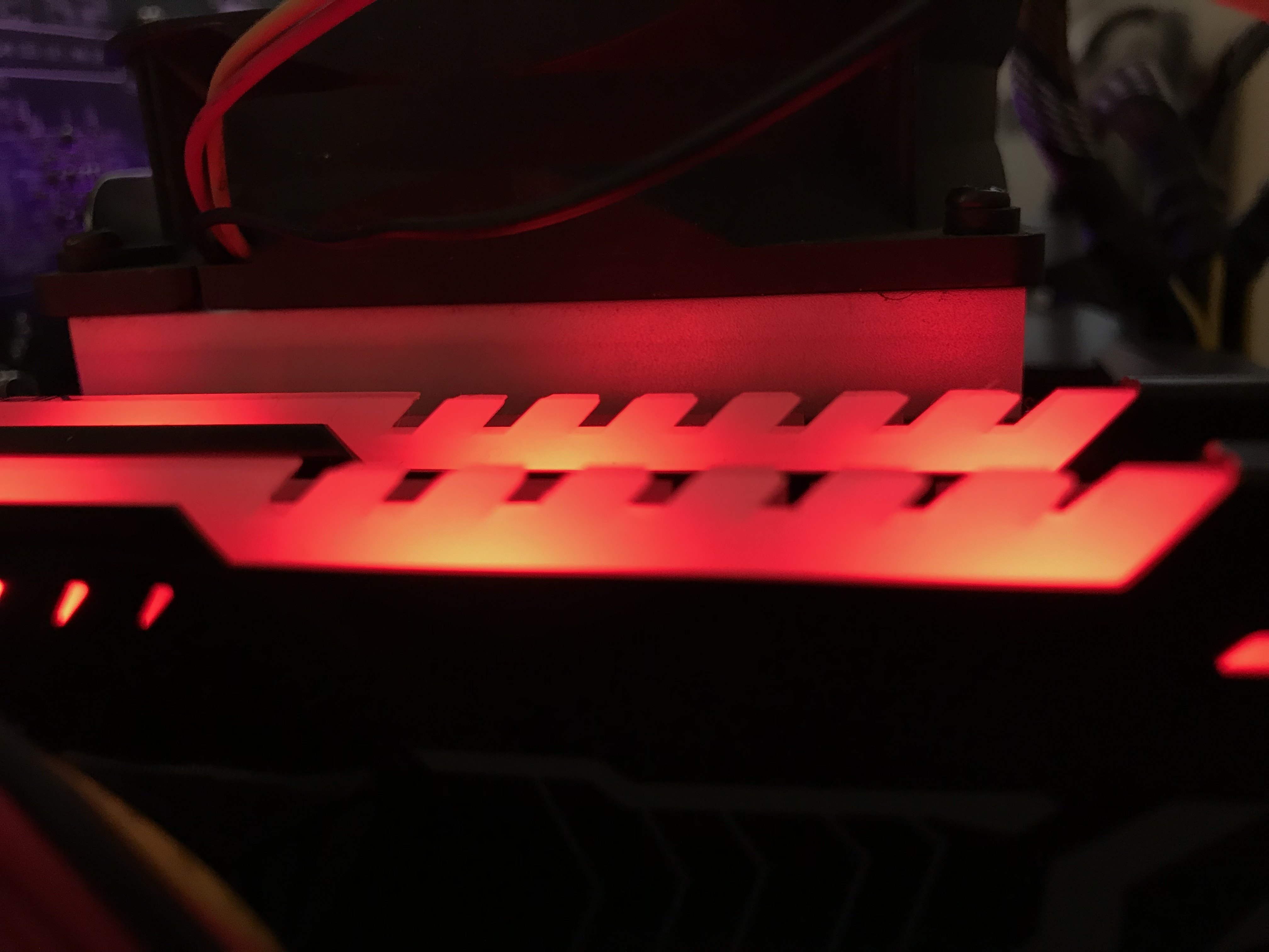 Подсветка автоматически загорается при включении системы, точнее при подаче питания на плату. Судя по неравномерности распределения свечения, внутри установлено по четыре красных светодиода на модуль. Яркость умеренная, её как раз хватает, чтобы сделать память заметной, но вместе с тем оставить "воздуха" для других красочных элементов системы. На фотографиях память установлена вместе с другим комплектом от компании Patriot, описание которого вы уже могли видеть в разделе "инструментарий". Как видно — высота планок с подсветкой значительно превосходит высоту соседей.