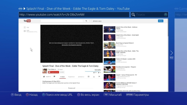В PS4 есть интернет-браузер. Он поддерживает HTML5, его интерфейс прост, позволяет одновременно работать с несколькими окнами, однако его функциональнось сильно ограничена из-за отсутствия поддержки Flash. Видеоролики на YouTube то запускаются, то требуют установки соответствующего плагина. Видеоролики на ВКонтакте нельзя развернуть на весь экран, пиктограммы плеера неактивны. Пробежавшись по многим популярным сайтам в рунете, которые предоставляют бесплатный видеоконтент, везде обнаружились проблемы.