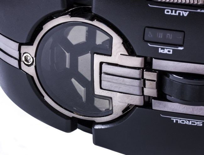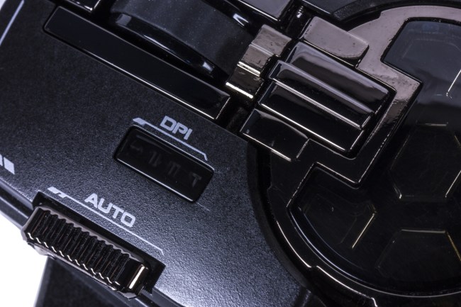 При первом знакомстве за кнопку принимается не клавиша переключения DPI, а небольшая пластиковая вставка с синим светодиодом с другой стороны колесика. На самом деле он просто сигнализирует о работе лазерного сенсора, загораясь при малейшем сдвиге (и отключить его нельзя). Маленькая рифленая кнопка на левой грани, помеченная как Auto, выполняет функцию двойного клика.