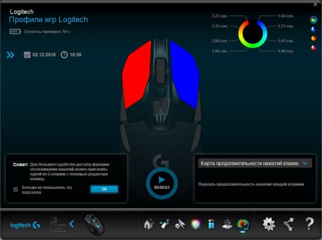 В седьмом разделе можно отслеживать такие важные показатели, как частота нажатий какой-либо клавиши, пройденное расстояние по коврику, продолжительность игры и т.д. Для начала «отслеживания» нужно зайти в само приложение и начать процесс вручную либо назначить это действие на любую доступную клавишу.
