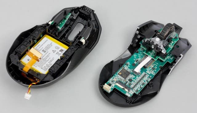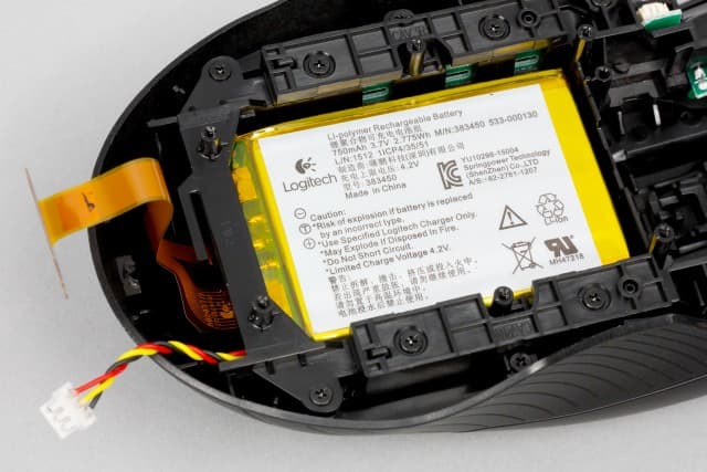 Здесь мы можем увидеть встроенный Li-Po-аккумулятор, который крепится к верхней части мыши. Ёмкость аккумулятора соответствует величине в 2 775 Вт·ч. Компания Logitech обещает, что ёмкости аккумулятора хватит на 24 часа игры в беспроводном режиме и при включенной светодиодной подсветке.