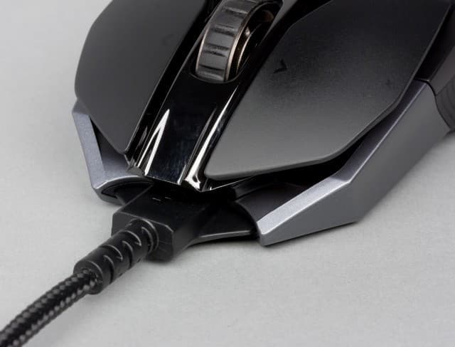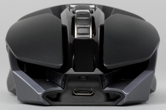 В передней части G900 Chaos Spectrum в углублении находится разъем micro-USB, который позволяет подключить мышь к ПК, а также зарядить встроенный аккумулятор. Для удобства ориентации при подключении интерфейсного кабеля к порту углубление вкруг него оснащено ключом, как и сам штекер. Кабель защищён толстым текстильным покрытием, которое, несомненно, увеличит срок его службы.