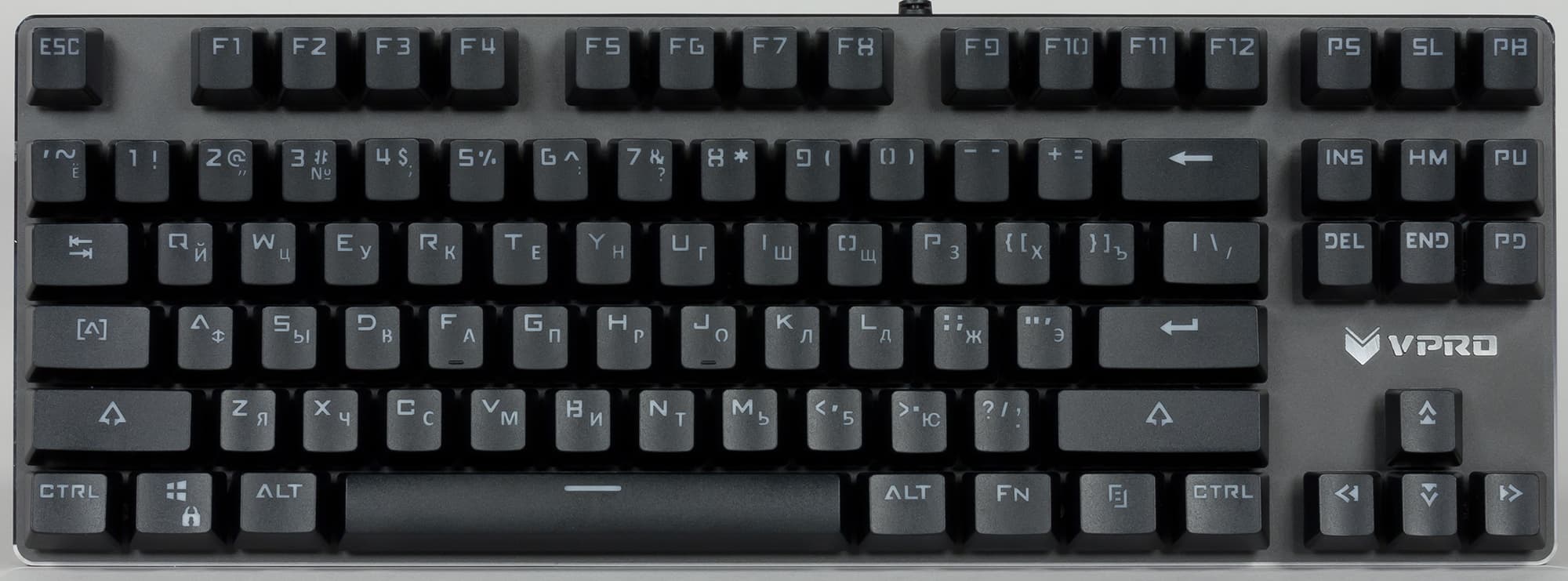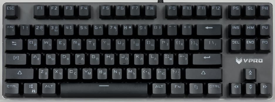 Корпус клавиатуры выполнен из пластика, основание — из приятного на ощупь, чуть шершавого металла. Это несколько увеличивает вес клавиатуры, однако позволяет клавишам не проседать при печати и повышает удобство эксплуатации. Над стрелочным блоком расположен металлический логотип VPRO.