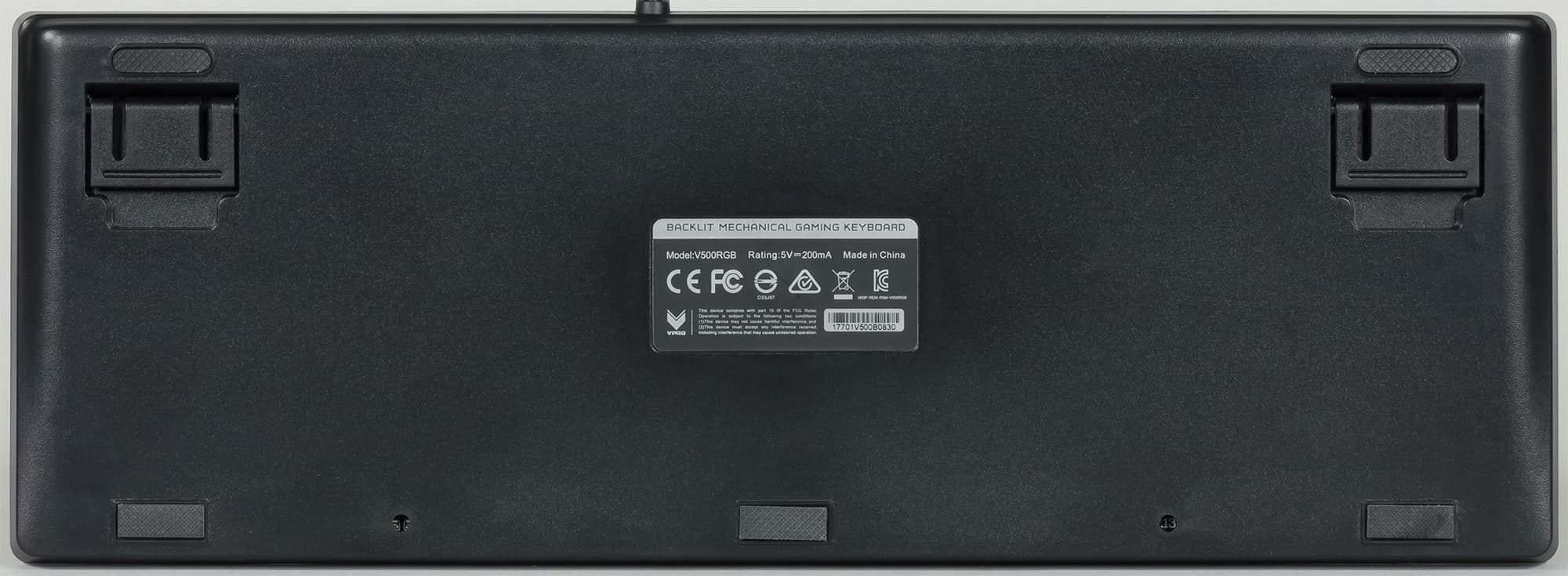 На задней грани находится пять резиновых ножек, препятствующих скольжению. В нижней части клавиатуры находятся два небольших дренажных отверстия для удаления попавшей на клавиатуру жидкости.