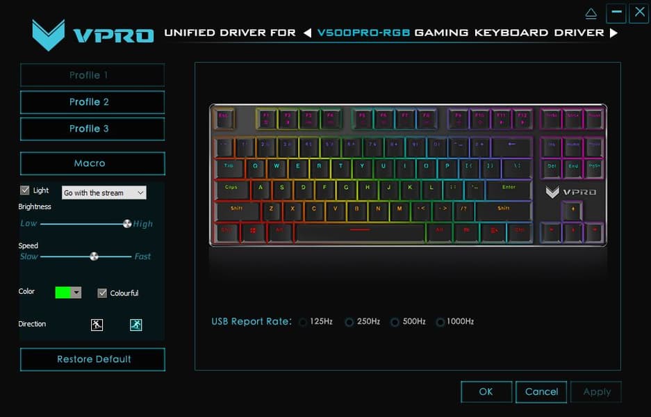 Rapoo V500RGB Alloy — игровая механическая клавиатура с синими переключателями, очень компактными размерами и возможностью настройки с помощью фирменного ПО.