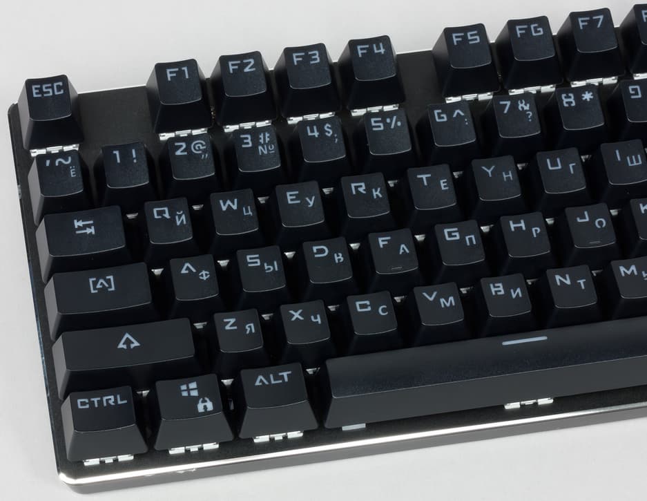 Стоит отметить, что клавиши лишены дополнительных обозначений, так что клавиатурные сообщения, необходимые для смены подсветки, к примеру, придётся запомнить. Шрифт латиницы стилизованный, что привычно для игрового сегмента устройств.