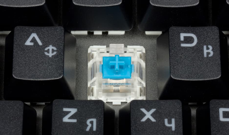 Внутри каждой клавиши расположен переключатель Rapoo Blue с ресурсом в 60 млн нажатий. Над переключателем находится RGB-светодиод.