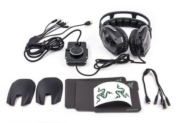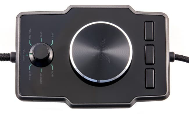 Увесистый контроллер гарнитуры на широком резиновом основании разделяет кабель на расстоянии примерно метра от гарнитуры. С помощью переключателя и колесика можно настроить громкость каждой из пяти пар динамиков и гарнитуры в целом, а также микрофона. При нажатии на большое колесико, регулирующее громкость, включается заглушение наушников. Razer стоило добавить подсветку к верхнему переключателю, чтобы было легче ориентироваться при настройке.