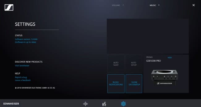В третьем разделе можно посмотреть и обновить версию приложения, а также прошивок гарнитуры и трансмиттера GSA 70. Также можно настроить, когда приложение будет скрываться и будет ли появляться при старте ПК. При желании можно отправить рапорт об обнаруженной ошибке в приложении.