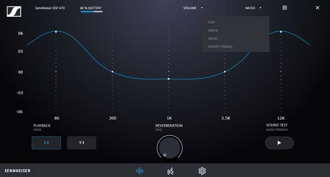 Гарнитура Sennheiser 670 выделяется очень сильным акцентом на низкие частоты. Кажется, что баса слишком много, хоть он и неплохого качества. Для Windows 10 имеются пресеты APO эквалайзера для фирменного приложения, которыми стоит воспользоваться. Средние частоты нельзя назвать плохими, но им хотелось бы пожелать больше детальности. Высоких частот многовато, но ничего плохого про них сказать нельзя. В целом по качеству звука эта модель — середнячок: её нельзя назвать ни плохой, ни выдающейся. Музыку можно послушать, если очень хочется, но всё же звук больше рассчитан на игровые приложения.