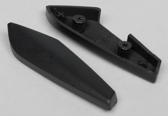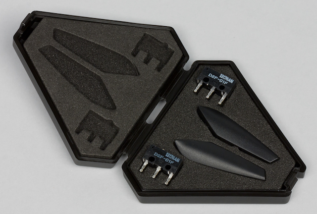 Пожалуй, самым интересным будет именно красивая коробочка с запасными элементами. Она имеет треугольную форму, и в ней в специальных отсеках на мягкой подложке находятся два сменных переключателя для основных кнопок и две заглушки для боковых кнопок. Подробнее об этом мы расскажем далее в тексте.