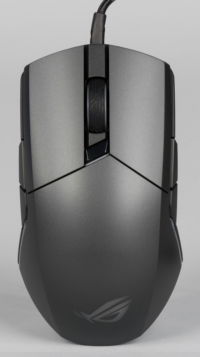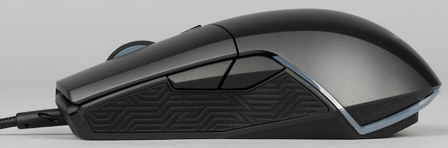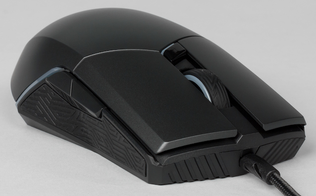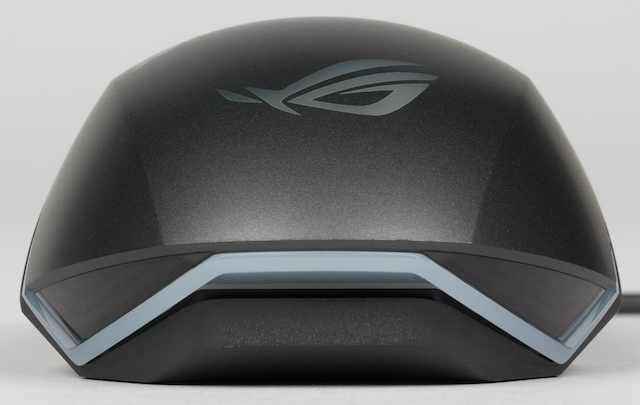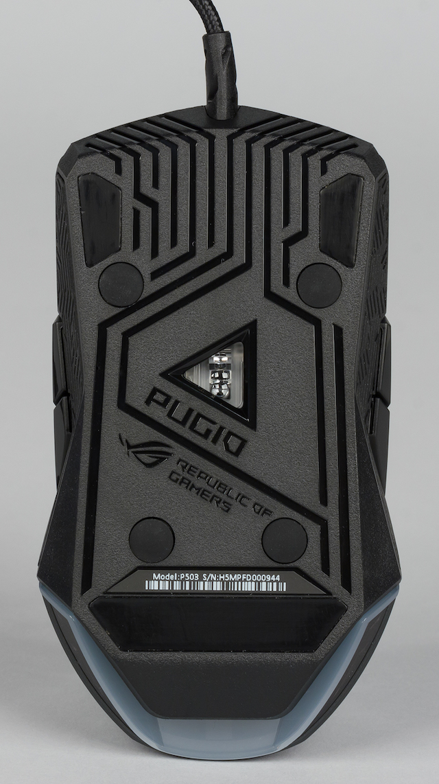Боковые стороны имеют скошенные к дну края, на которых установлены резиновые вставки с характерным для серии ROG рисунком. Это существенно повышает уверенность удержания мышки даже в пылу горячих сражений.