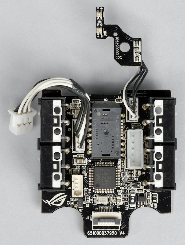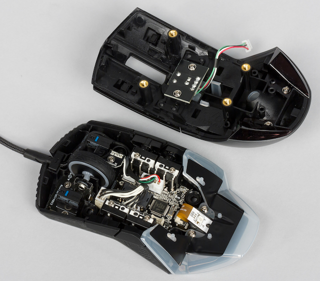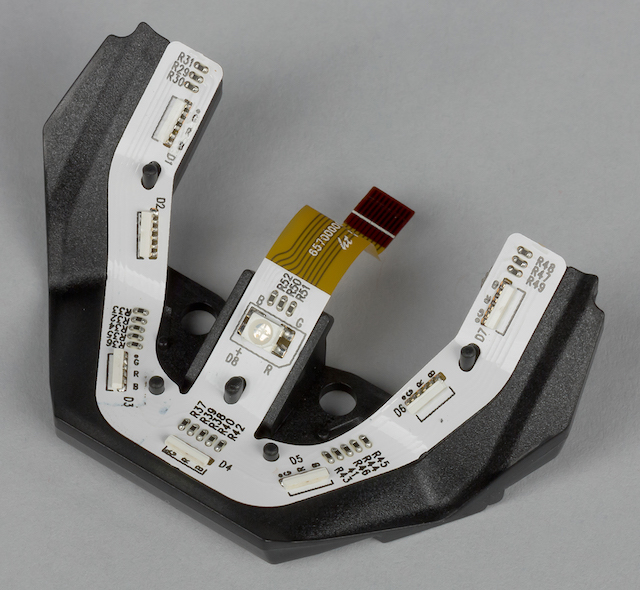 Его максимальное разрешение составляет 7200 сpi, для скорости заявлено 130 ips, а для ускорения — 30 g. Дополнительно есть платы для основных кнопок и колеса прокрутки, для кнопки со светодиодом переключения dpi и для подсветки колеса прокрутки. Кроме того, присутствует гибкая лента со светодиодами подсветки корпуса (их целых семь штук) и логотипа. Собрано всё на разъёмах и кабелях.
