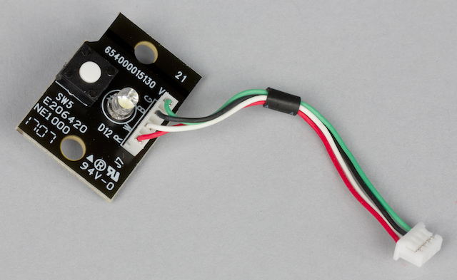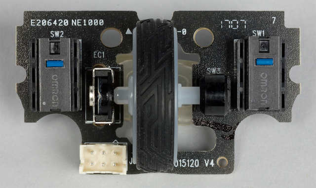 Диаметр колеса составляет 25,5 мм, один полный оборот оно проходит за 25 щелчков. Последние достаточно отчётливые и в то же время тихие. В мышке используется механический энкодер Alps. Производителя кнопки колеса опознать не удалось. По сравнению с двумя основными кнопками, её нажатие требует заметно большего усилия. Звук срабатывания глухой и не очень громкий.