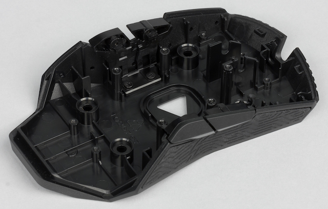 Винты, скрепляющие половинки корпуса, в количестве четырёх штук расположены под резиновыми пробками. Честно говоря, выглядит это немного инородно для дизайна мышки и, кроме того, требует ещё какого-то инструмента, кроме отвертки, для разборки. Отметим также, что здесь установлены именно винты — с ответными металлическими вставками-гайками, впаянными в стойки верхней части корпуса. Так что явно разбирать и собирать мышку можно будет много раз без каких-либо потерь надёжности конструкции.