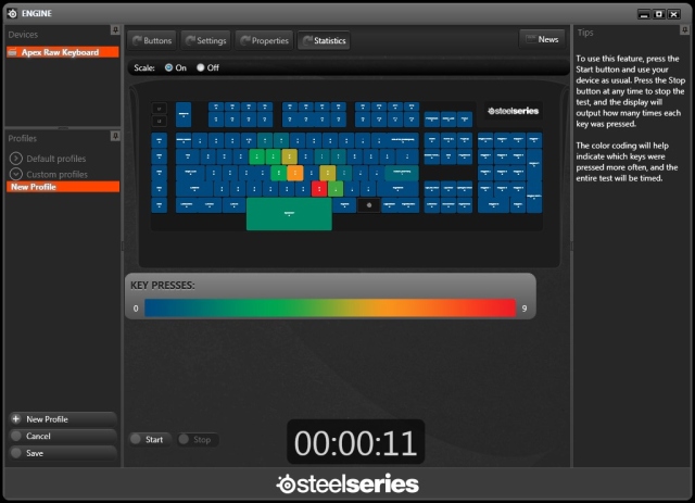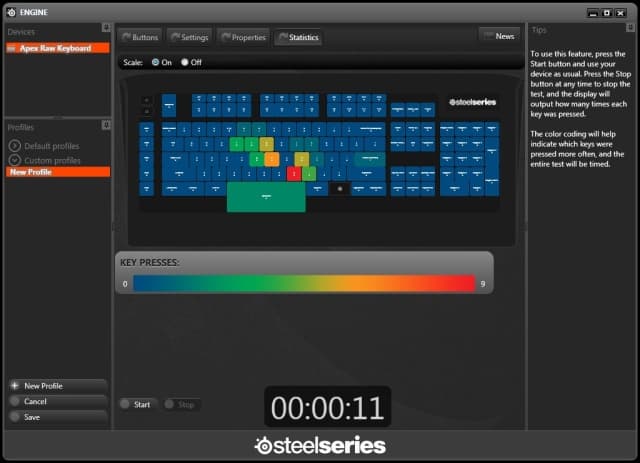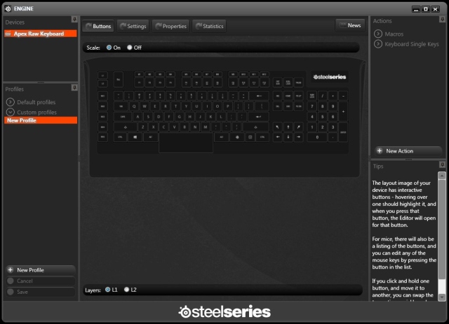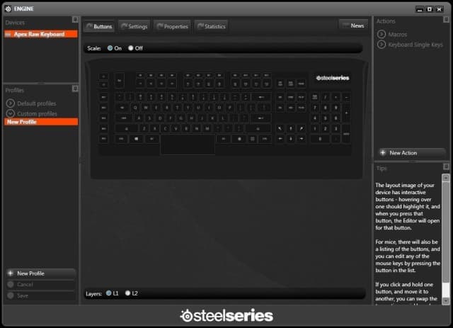Для всех своих продуктов компания разработала единую утилиту. В ней можно настроить команды не только на кнопки M и MX, но и на все остальные, за исключением L1, L2 и клавиши Steelseries. Профили сохраняются в виде файлов на жестком диске; сама клавиатура памяти не имеет.