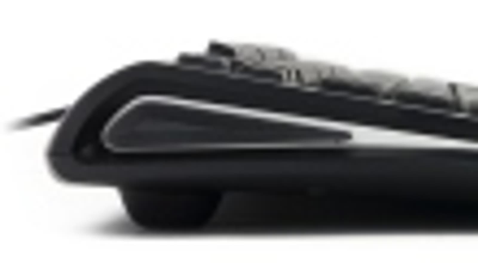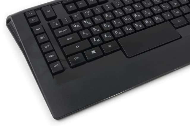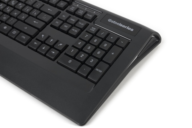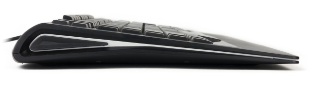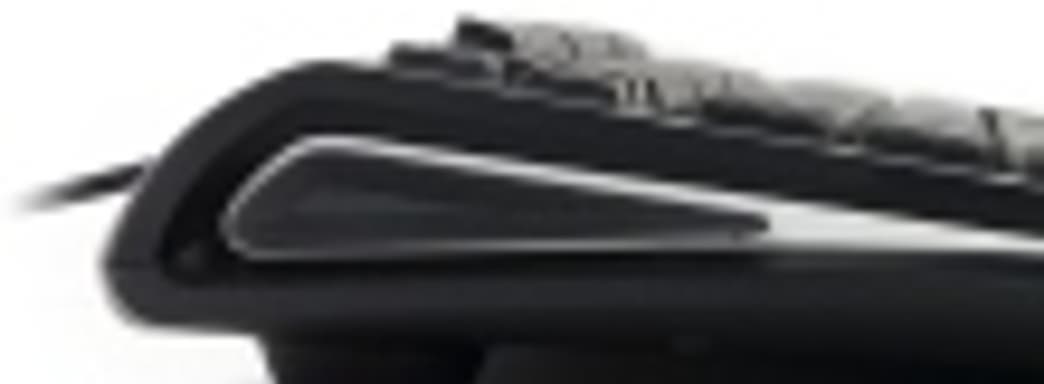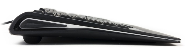 Корпус клавиатуры имеет классическую прямоугольную форму и лишь немного закруглен в верхних углах. Довольно узкая полоса шероховатого пластика под кнопками отведена для запястий; сами же элементы управления обрамляются глянцевой вставкой.