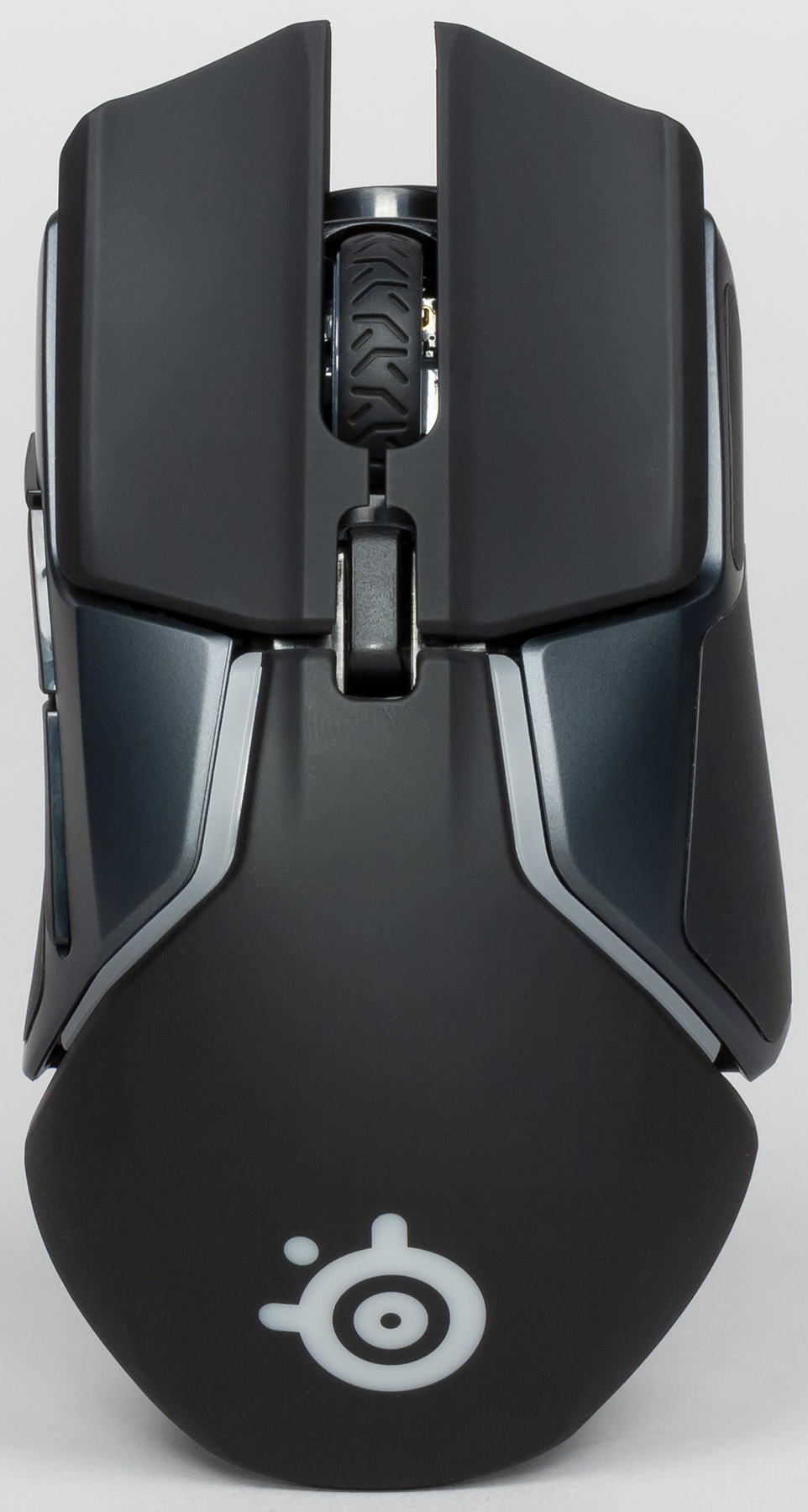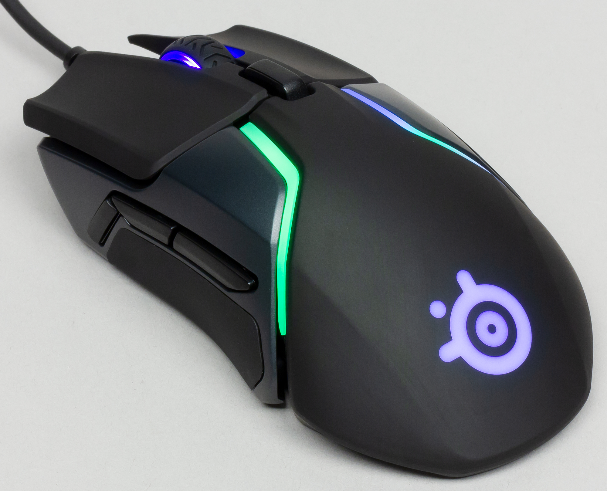 Корпус выполнен из чёрного матового пластика с резиновыми накладками на боковых панелях — они предотвращают скольжение манипулятора в руке. Основные кликеры — с широкими накладками и выемками под пальцы. Колесо механическое, с дискретным ходом, выступает над верхней панелью на 2–3 мм и имеет резиновую накладку с узором. На верхней панели рядом с колесом и основными кликерами расположена кнопка переключения пресетов CPI, на тыльной стороне верхней панели — логотип компании SteelSeries, это же одна из зон RGB-подсветки.