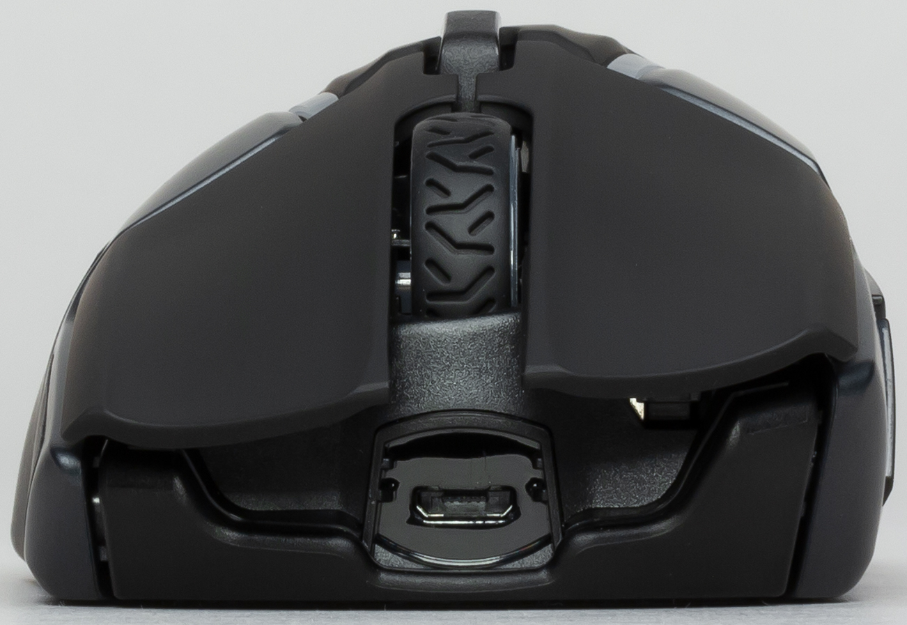 Спереди под нависающими основными кнопками есть утопленный в корпус разъём Micro-USB. Он предназначен для зарядки и для подключения мыши в проводном режиме. Для того чтобы подключиться по проводу, нужно просто присоединить устройство к компьютеру посредством комплектного кабеля.