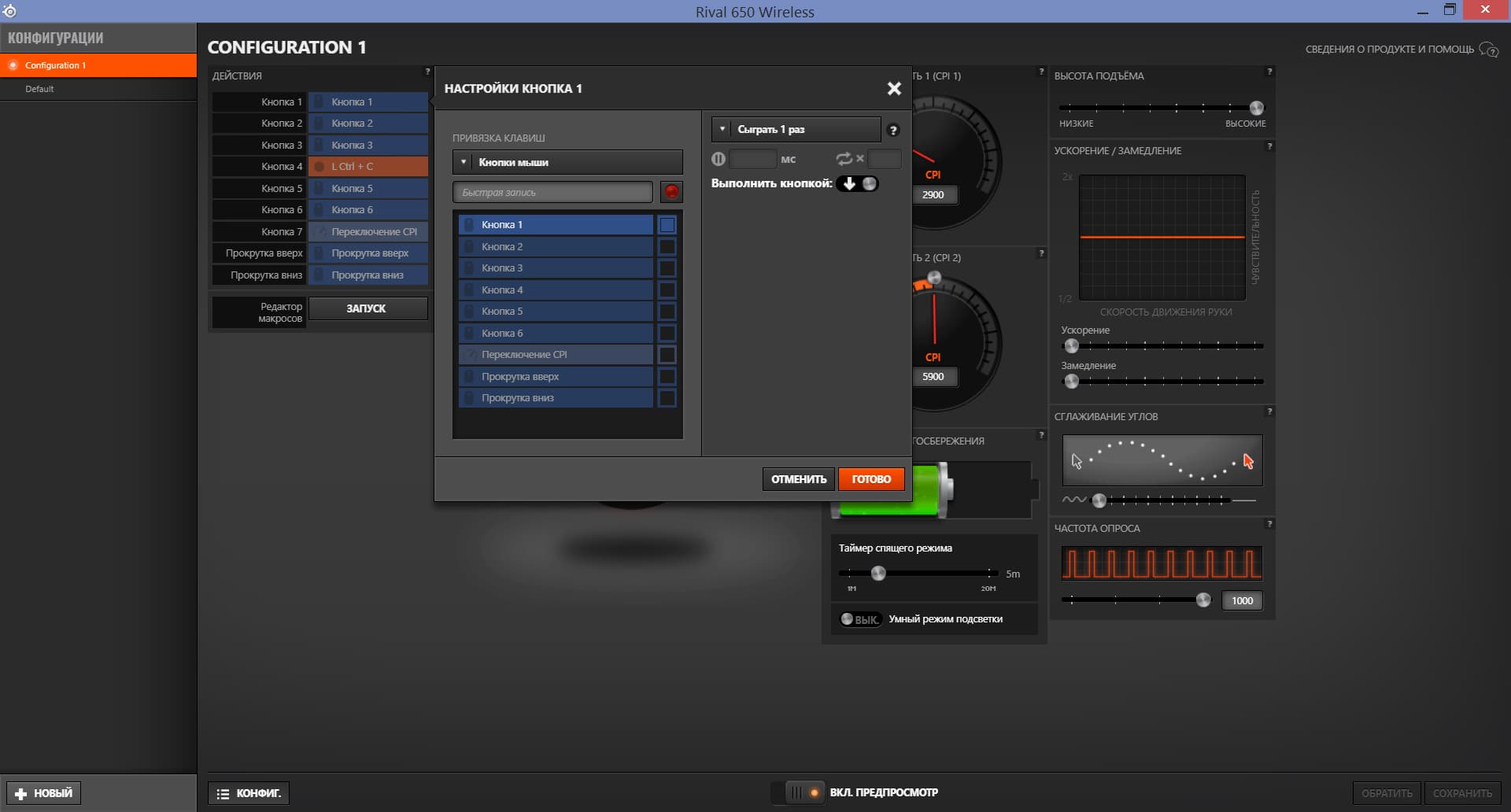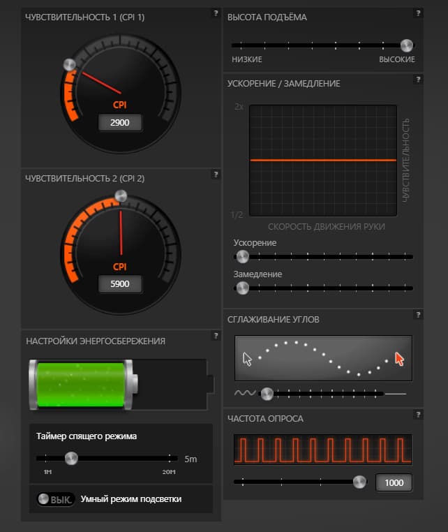 В настройках CPI есть два пресета, которые переключаются нажатием клавиши, значение выбирать между 200 до 12 000. Здесь же настраивается высота отрыва для дополнительного сенсора и алгоритм поведения мыши при замедлении/ускорении, а также регулируются сглаживание углов и частота опроса (начиная со 125 Гц). Для экономии заряда можно настроить время, по истечении которого мышь перейдёт в спящий режим. С этой же целью тут есть режим «умной» подсветки: когда он включён, подсветка не работает, если мышь движется.