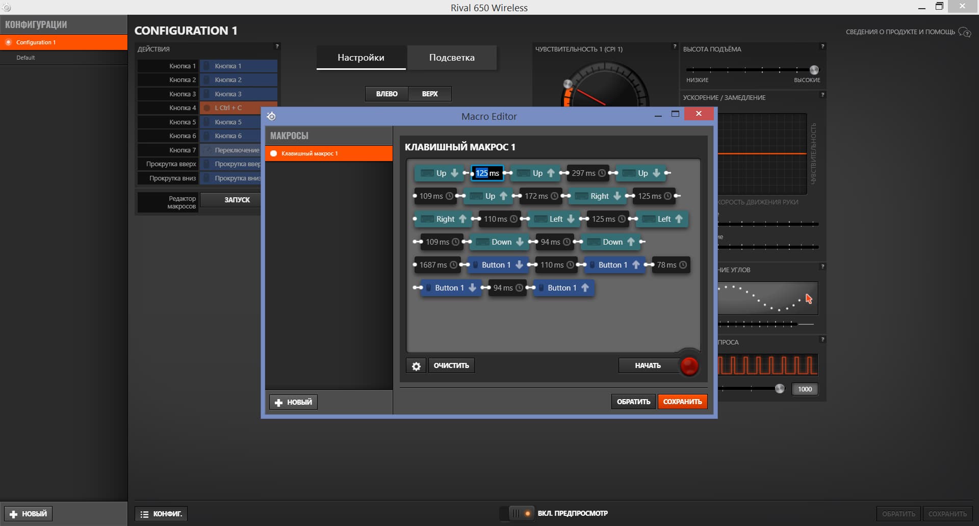 Мышь настраивается при помощи универсальной утилиты SteelSeries Engine 3. Кроме кнопки настройки CPI, можно менять значения любой кнопки или поворота колеса, назначать любую клавишу или сочетание клавиш с клавиатуры и записывать макросы в упрощённом режиме.