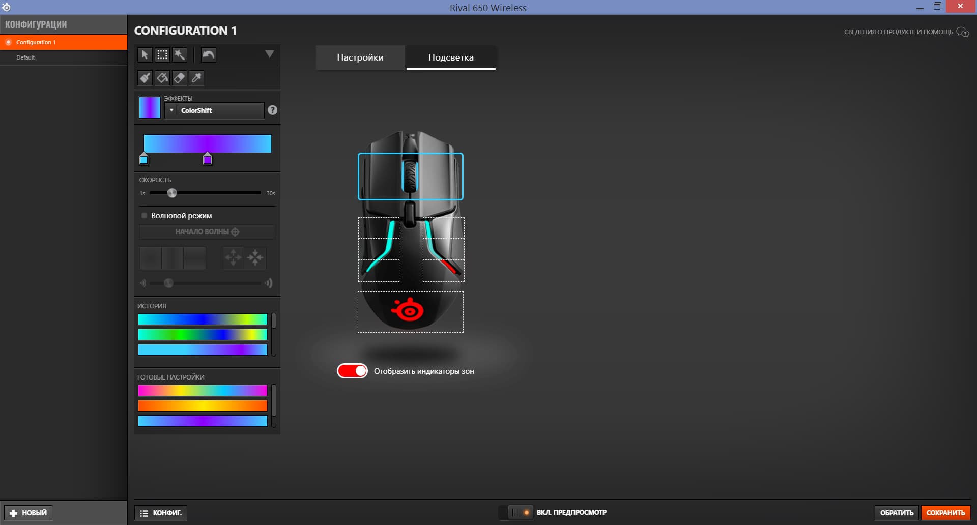 Часть настроек сохраняется в памяти самой мыши, поэтому если её подключить к другому компьютеру без ПО SteelSeries, она будет работать с той же схемой подсветки и тем же разрешением сенсоров. Значения клавиш, правда, сбрасываются на дефолтные, а боковые кнопки работают в режиме навигации.