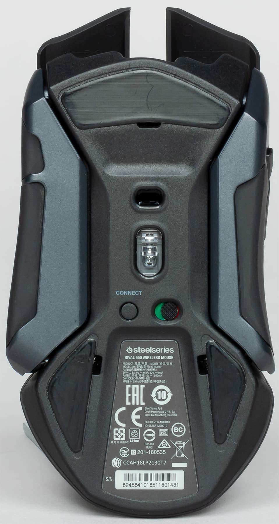Чтобы мышь хорошо скользила по поверхности стола, снизу наклеены три тефлоновые накладки. У них есть отверстия для удобного и быстрого демонтажа. Также на нижней панели находится переключатель ON/OFF, кнопка принудительного подключения и отверстия для сенсоров.
