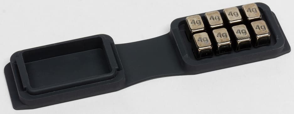 Под ними есть резиновые холдеры для грузиков, по четыре с каждой стороны. Меняя расположение и количество грузиков можно добиться нужного веса и баланса. Масса устройства варьируется от 121 грамма (без грузиков) до 153 граммов (со всеми грузиками на борту).