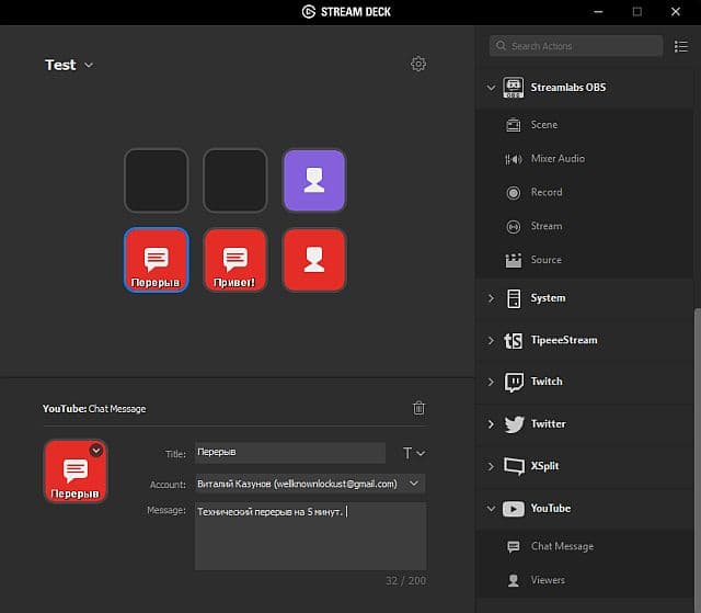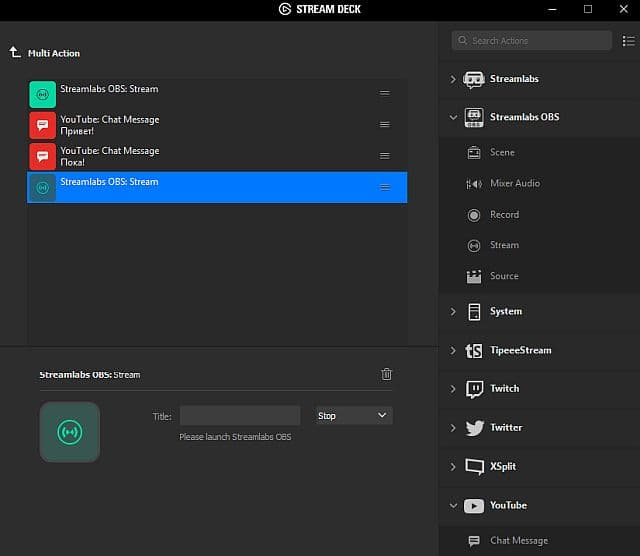 Что касается трансляций, то тут Stream Deck Mini показывает себя во всей красе, поскольку в ПО есть предустановленные настройки для работы с популярными стриминговыми программами (OBS Studio, Streamlabs, TipeeStream, XSplit), сервисами (Twitch, YouTube и даже Mixer), есть доступ к Twitter.