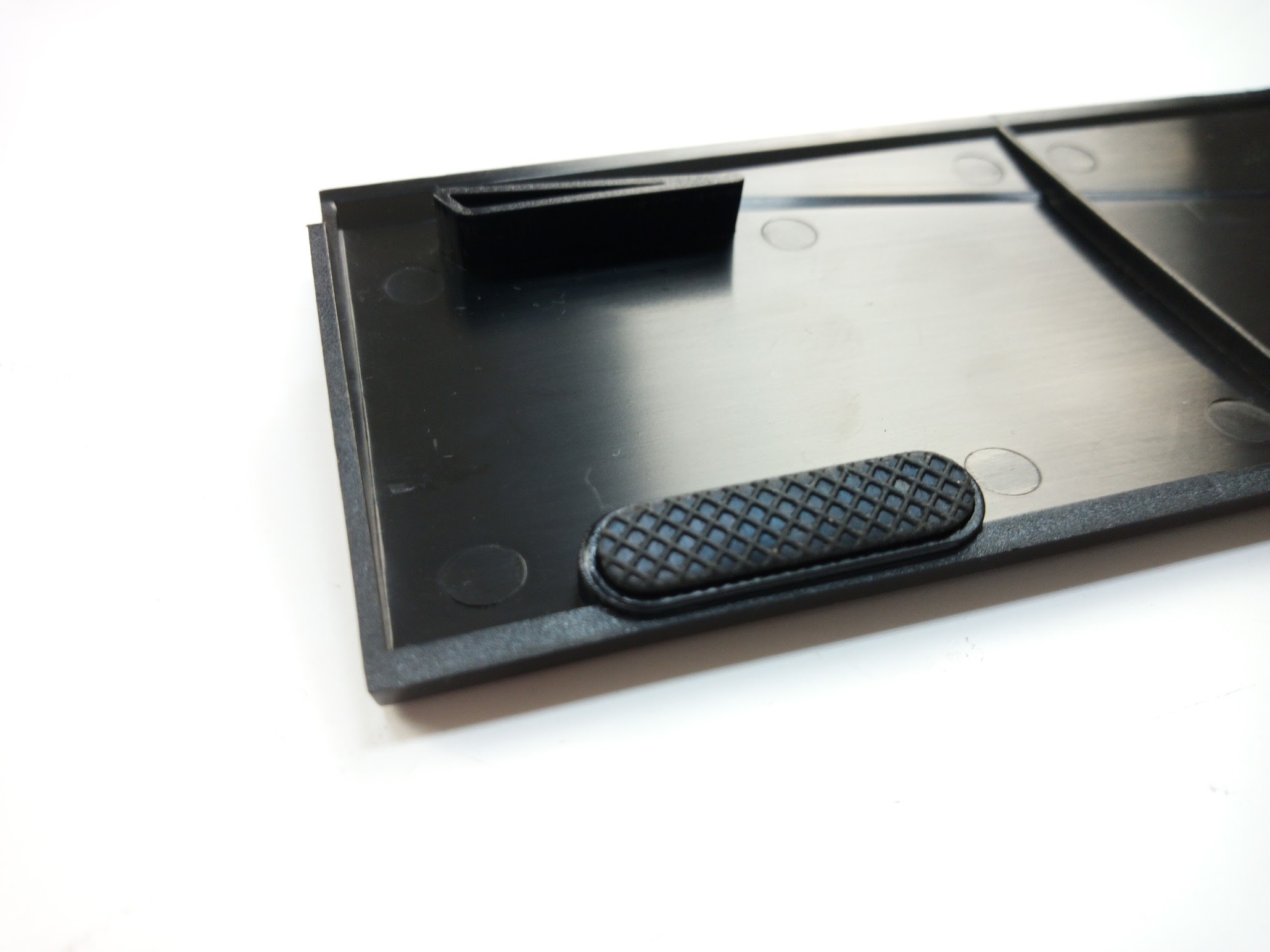 На корпусе подставки есть два пластиковых выступа, которые просто ложатся в отверстия на клавиатуре, никак не защёлкиваясь. С одной стороны, это позволяет быстро снимать и устанавливать подставку в зависимости от ситуации, с другой — при перемещении клавиатуры с места на место её придётся придерживать руками. Подставка выполнена из чёрного шершавого пластика, на который нанесён логотип компании.