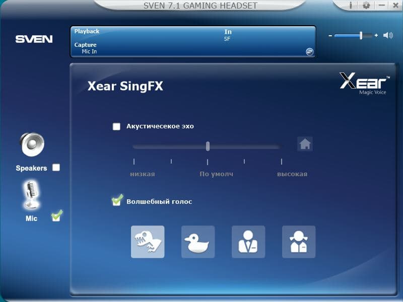 Дополнительные настройки микрофона открываются аналогичным образом — двойным кликом по иконке "Mic". Здесь пользователь может выбрать частоту дискретизации входящего сигнала, выключить усиление микрофона и повесить на голос какие-либо эффекты. Подойдёт любителям голосового общения в играх.
