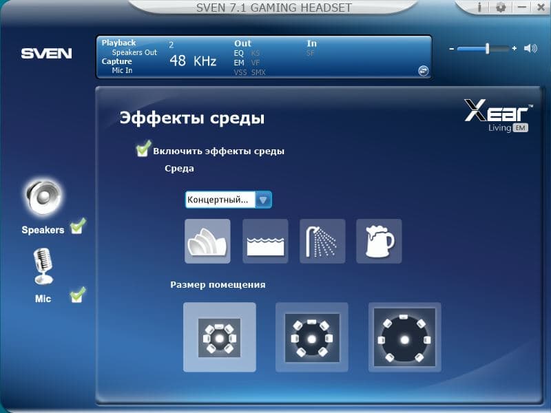 В остальных пунктах можно выбрать различные пространственные эффекты и включить виртуальный 7.1 звук. Практическая польза этих настроек невелика, однако зайти и поиграться с ними можно, если вы слушаете, к примеру, электронную музыку и любите эксперименты. Также понижение или повышение тональности звука может быть полезно, если вы поёте вместе с воспроизводимой песней, но тональность вокалиста для вас высоковата.