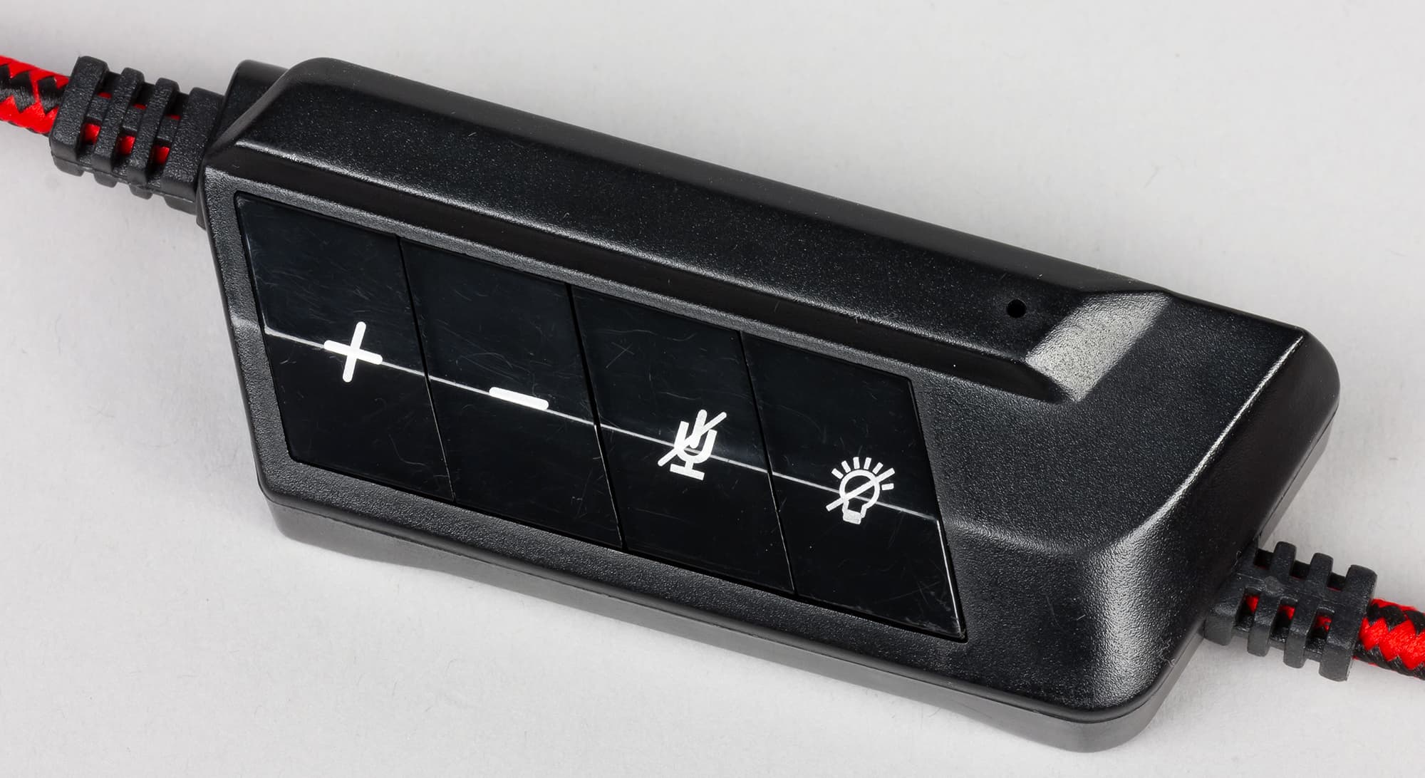Кабель заключён в плотную тканевую двухцветную оплётку, предотвращающую его преждевременное истирание. Длины в 2,2 метра хватит для подключения устройства к системам, находящимся на приличном удалении от пользователя. На кабеле расположен небольшой пульт управления с четырьмя клавишами, отвечающими за громкость, отключение микрофона и подсветки. Ход клавиш средний, усилие нажатия небольшое. В целом пульт смотрится достаточно органично.