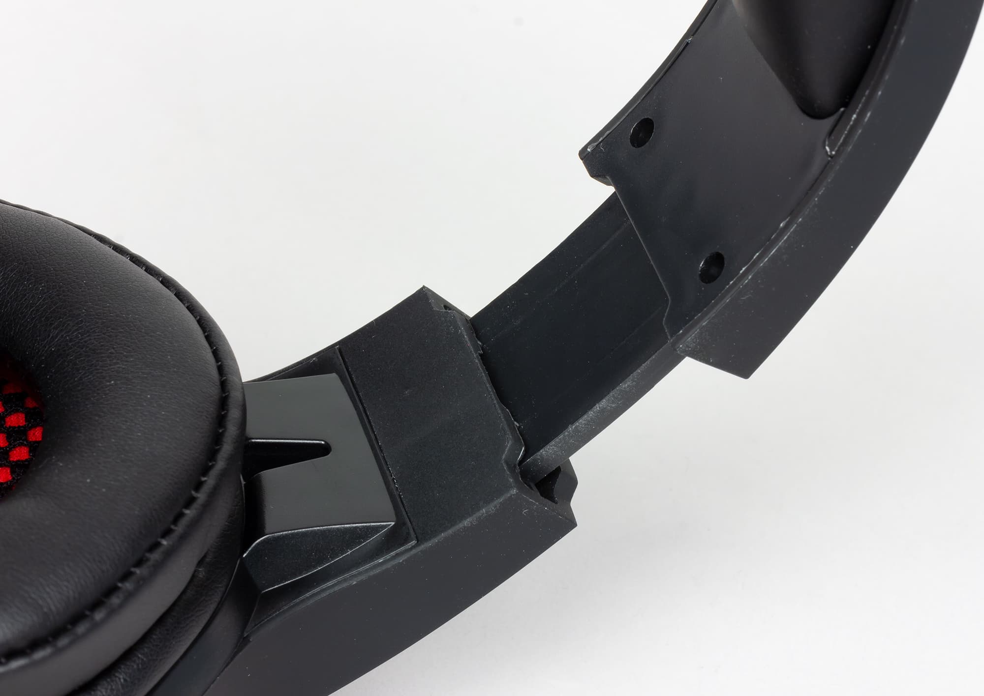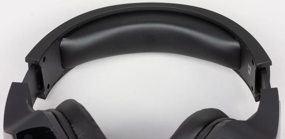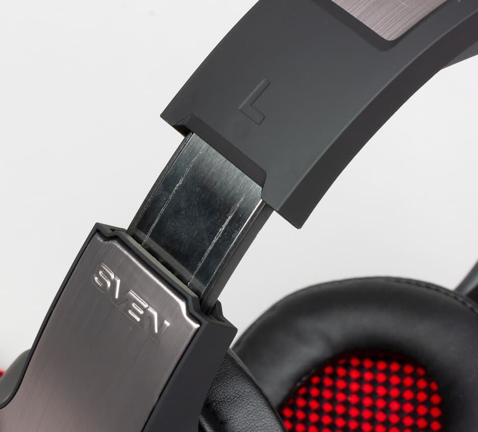 Оголовье наушников представляет собой металлическую пластину с рельефными пластиковыми накладками. С внешней части пластик не полностью закрывает пластину основания, открывая взгляду шлифованные участки основания.