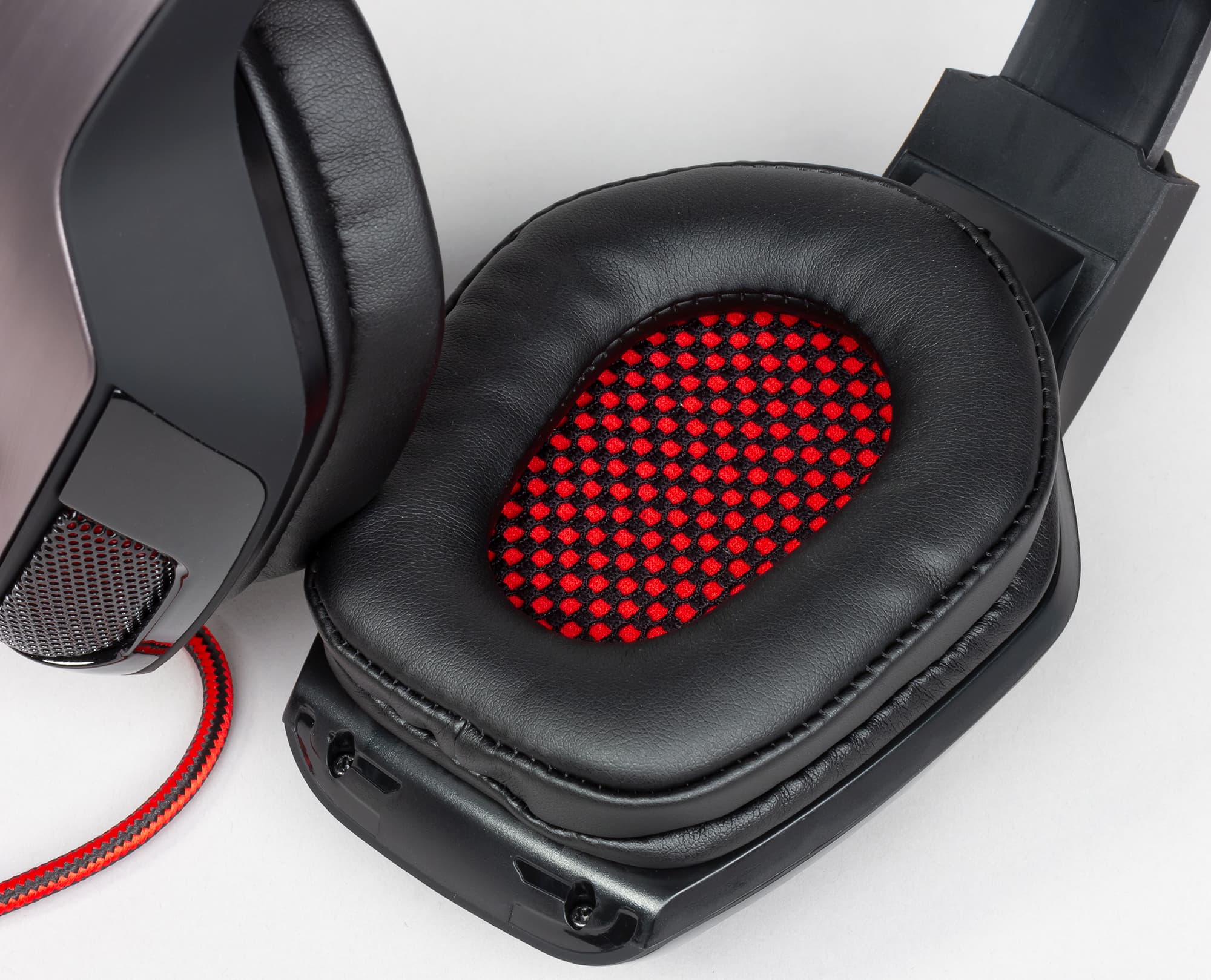 Амбушюры выполнены из искусственной кожи с наполнением из вспененного материала. В центре виднеется красно-чёрная защитная сетка динамика. Амбушюры целиком закрывают ухо, однако их размеров чуть не хватает для того, чтобы уши не касались сетки. Впрочем, сетка и амбушюры практически не давят на уши.